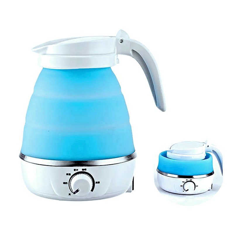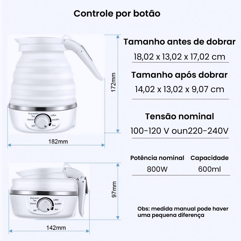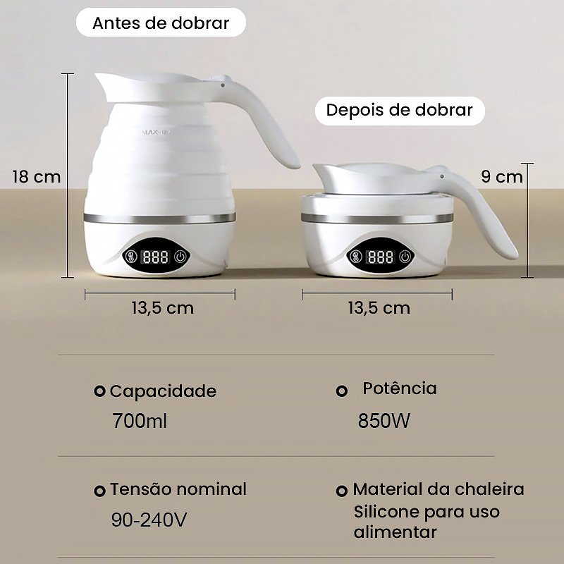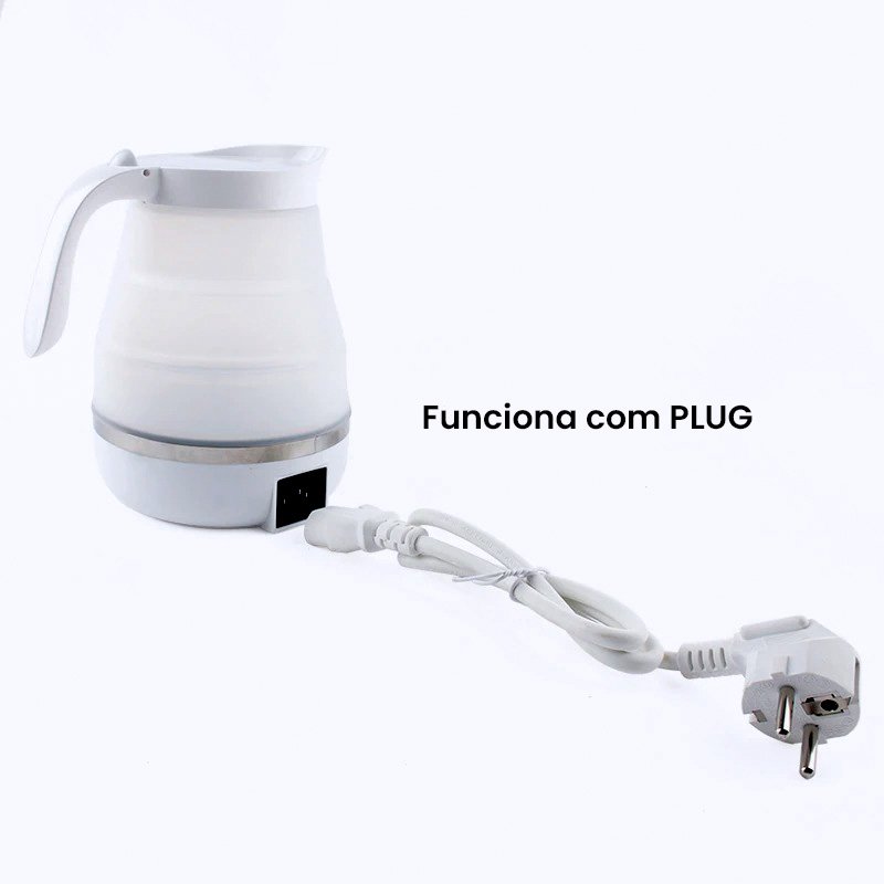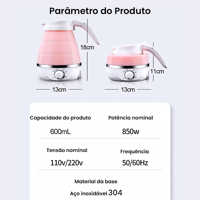Chaleira elétrica dobrável de silicone, 110v/220v para viagem, ferve a água em poucos minutos graças ao seu sistema de aquecimento rápido e desligamento automático. É segura e durável feita com silicone especial para uso alimentício com forro em aço inox garantindo a qualidade.