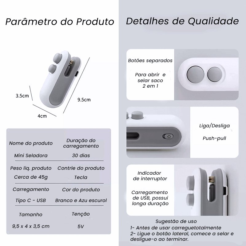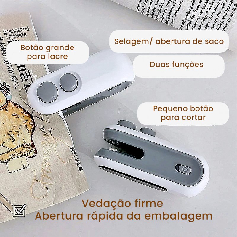 • Praticidade no Dia a Dia: Pequena, leve e fácil de usar, ela se adapta perfeitamente à sua rotina agitada. Com apenas um movimento, você sela sacos de forma rápida e eficiente, sem complicações. Leve-a para qualquer lugar: na cozinha, no escritório, em viagens ou até no camping.